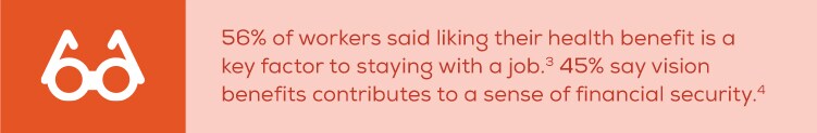 Regular vision care is a relatively low-cost way to improve a company’s bottom line, and in surprising ways. Research shows employees with an employer-provided vision benefit can maintain better overallhealth and are more likely to stay with the company.3 Further, comprehensive vision benefits can be effective at attracting top talent, as 62% of workers described vision benefits as a “must have” when evaluating job offers.3