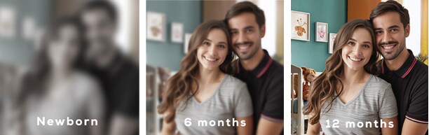 At birth, a newborn’s vision is blurry and limited to high-contrast shapes and movement. By 2 to 3 months, babies start tracking objects and recognizing faces—but they can only see clearly within 8 to 12 inches of their face. By age 1, a baby’s vision has improved significantly, approaching adult-like clarity, though some fine-tuning continues. By age 6, eye coordination improves, but conditions like lazy eye (amblyopia) or eye misalignment (strabismus) may start to appear. Regular eye exams in early childhood are key to detecting and treating these issues early.